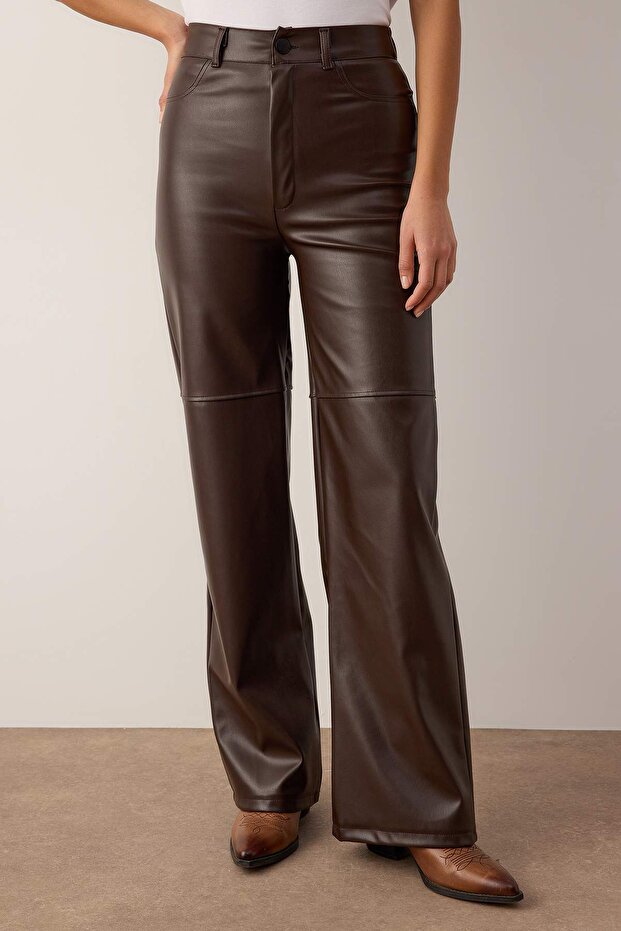 Brown Faux Leather Flare Pants | Relaxed Seam Detail | AtikaStyle