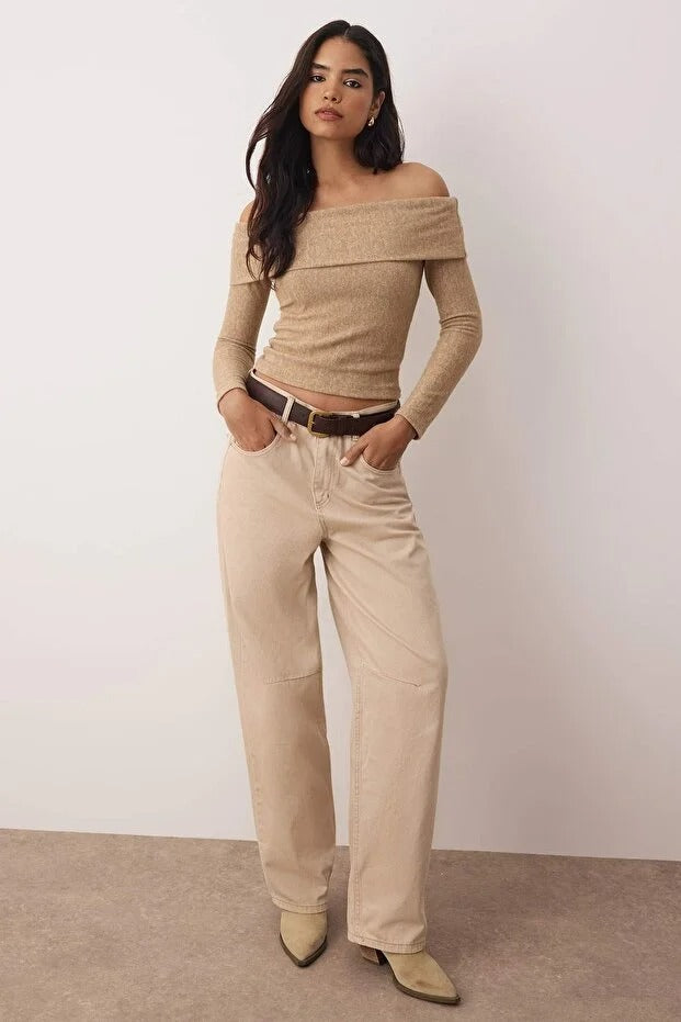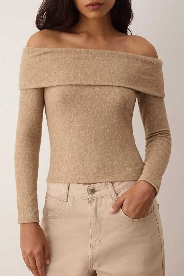 Soft, feminine, and easy to style. This beige off‑shoulder knit blouse features a carmen neckline and body‑hugging stretch for an elegant, elevated everyday look.