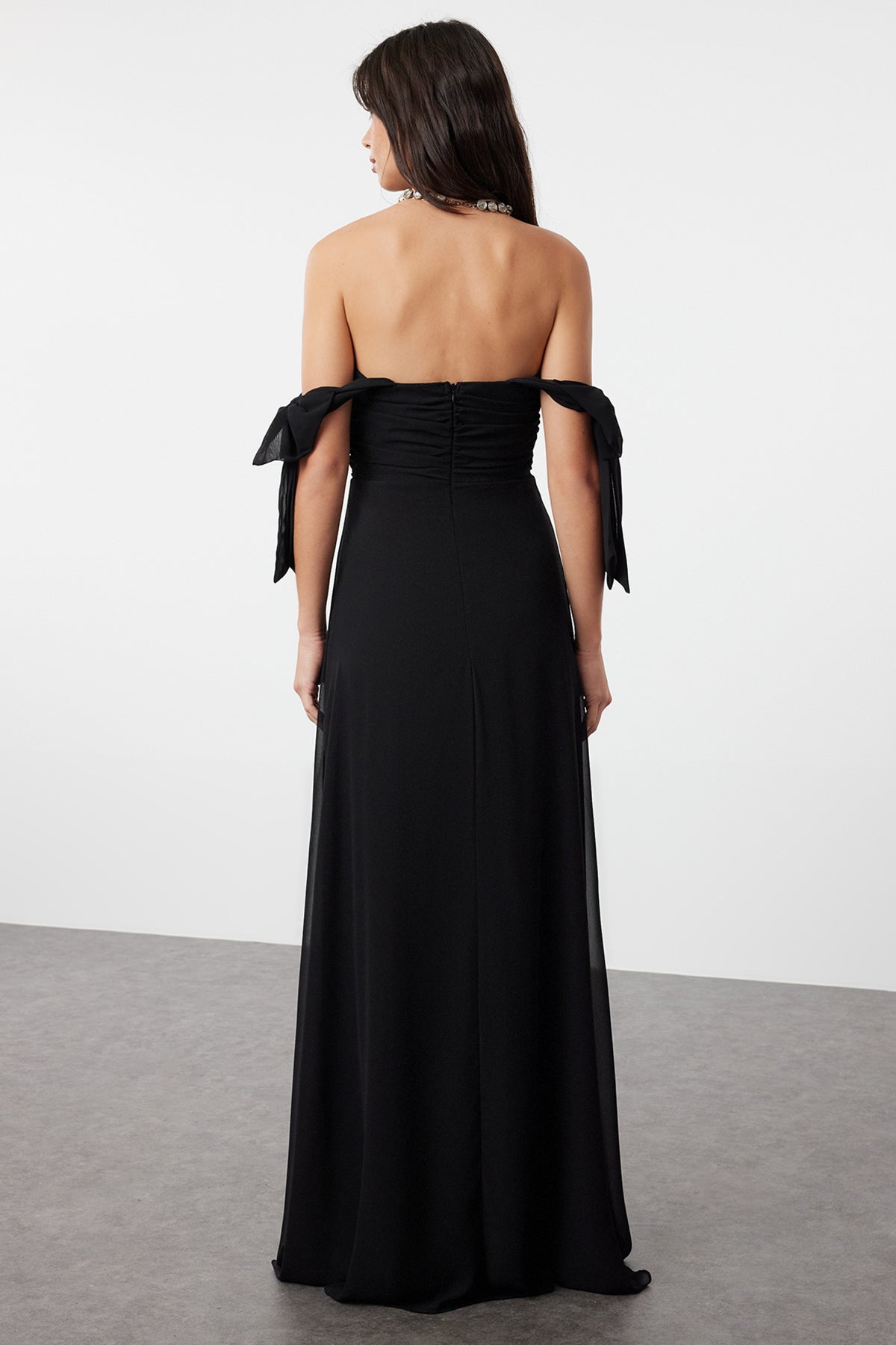 Black Off Shoulder Tie Sleeve Evening Maxi Dress | Elegant Formal Gown | AtikaStyle