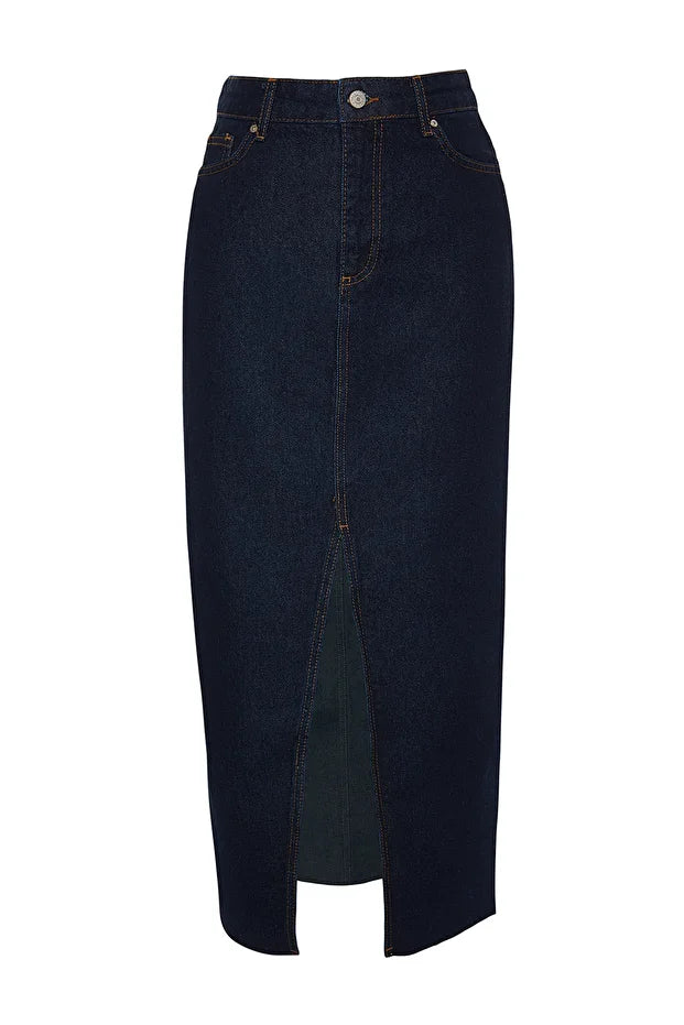 This black denim high-waist maxi skirt is a versatile must-have for your everyday wardrobe. Designed with a flattering high-rise fit and a front slit detail, it blends classic denim with an edgy street-style vibe. The full-length cut keeps it modest yet fashion-forward, while the durable denim fabric ensures all-day comfort.