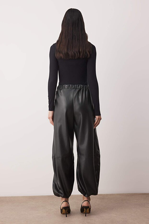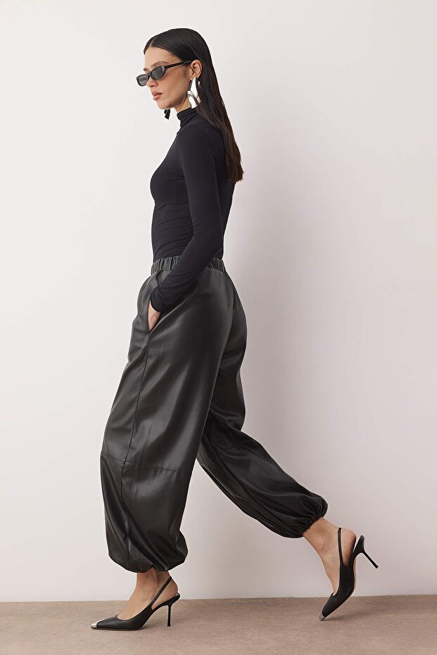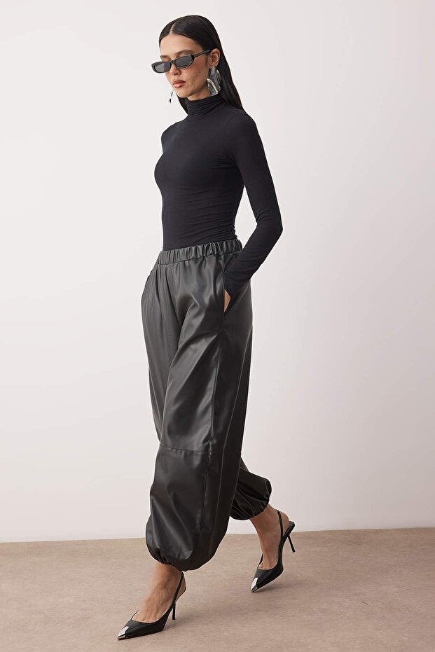 Designed in a Harem / tapered silhouette with a Elastic cuff; relaxed fit; night-out ready. The soft faux leather look adds instant polish—pair with a fitted tee and sneakers for daytime, or a bodysuit and heels for night.