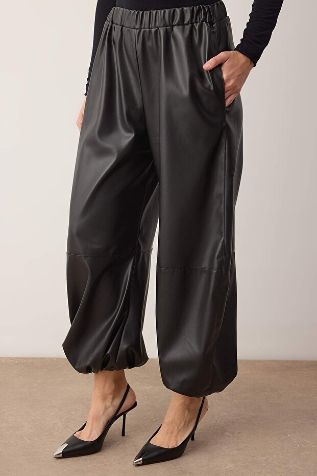 Black Faux Leather Harem Pants | Elastic Cuff | AtikaStyle
