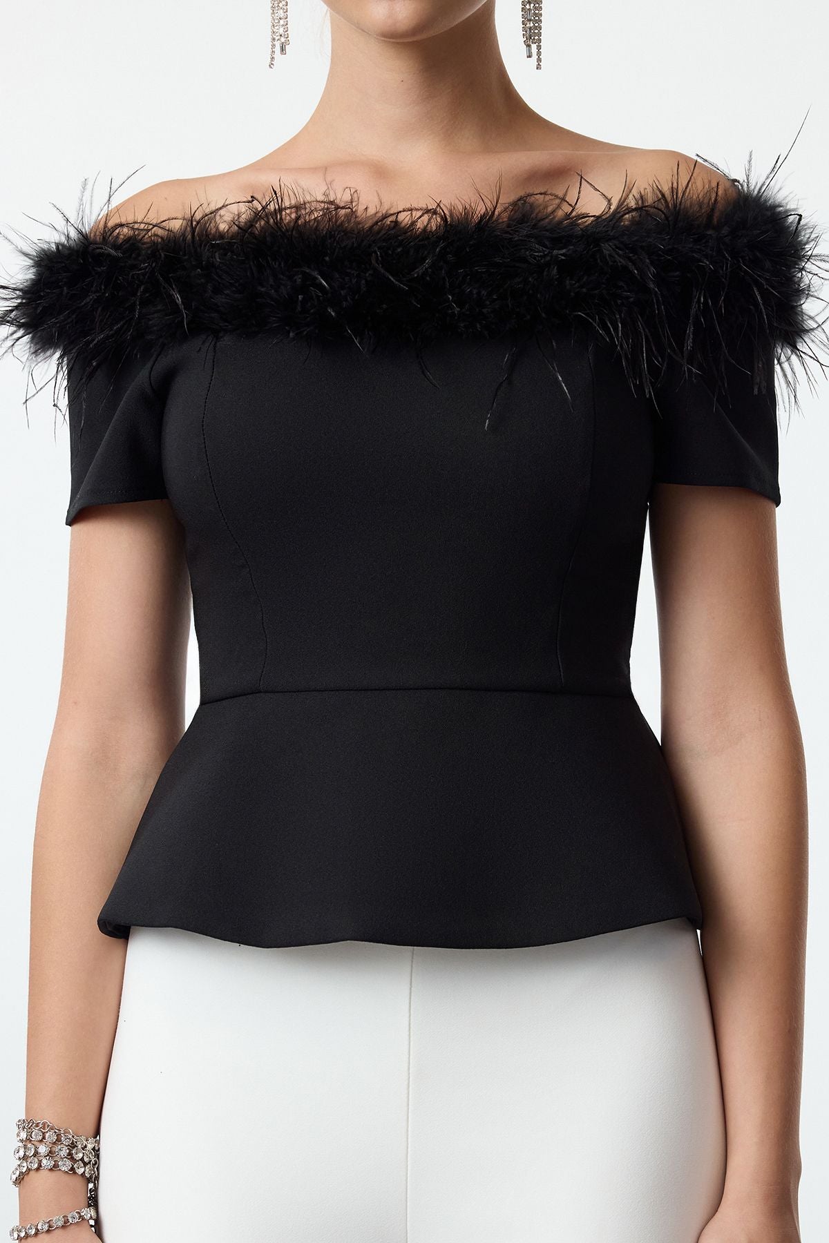 Chic Off-Shoulder Feather Trim Black Peplum Top - Elegant Eveningwear