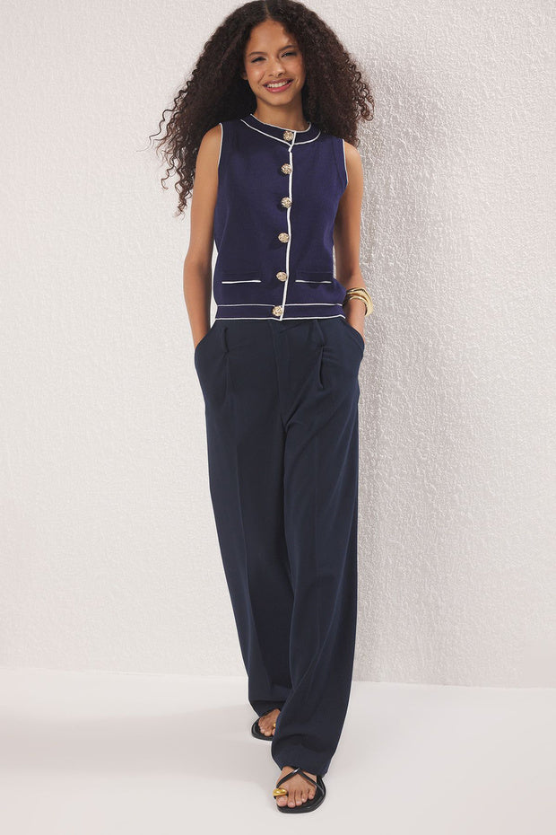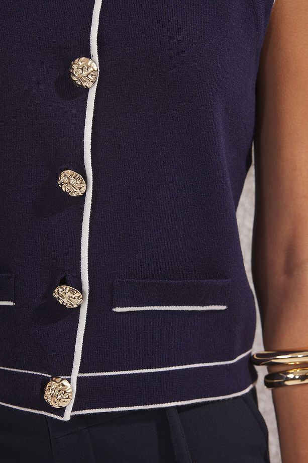 Elevate your wardrobe with this sleeveless white knit vest featuring luxurious gold embossed buttons and contrasting black piping detail. Perfectly tailored for a chic and timeless look, this piece transitions effortlessly from workwear to evening style. Pair it with tailored trousers, skirts, or jeans for a polished yet modern outfit.