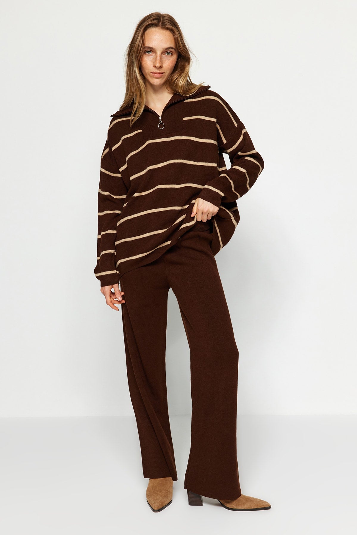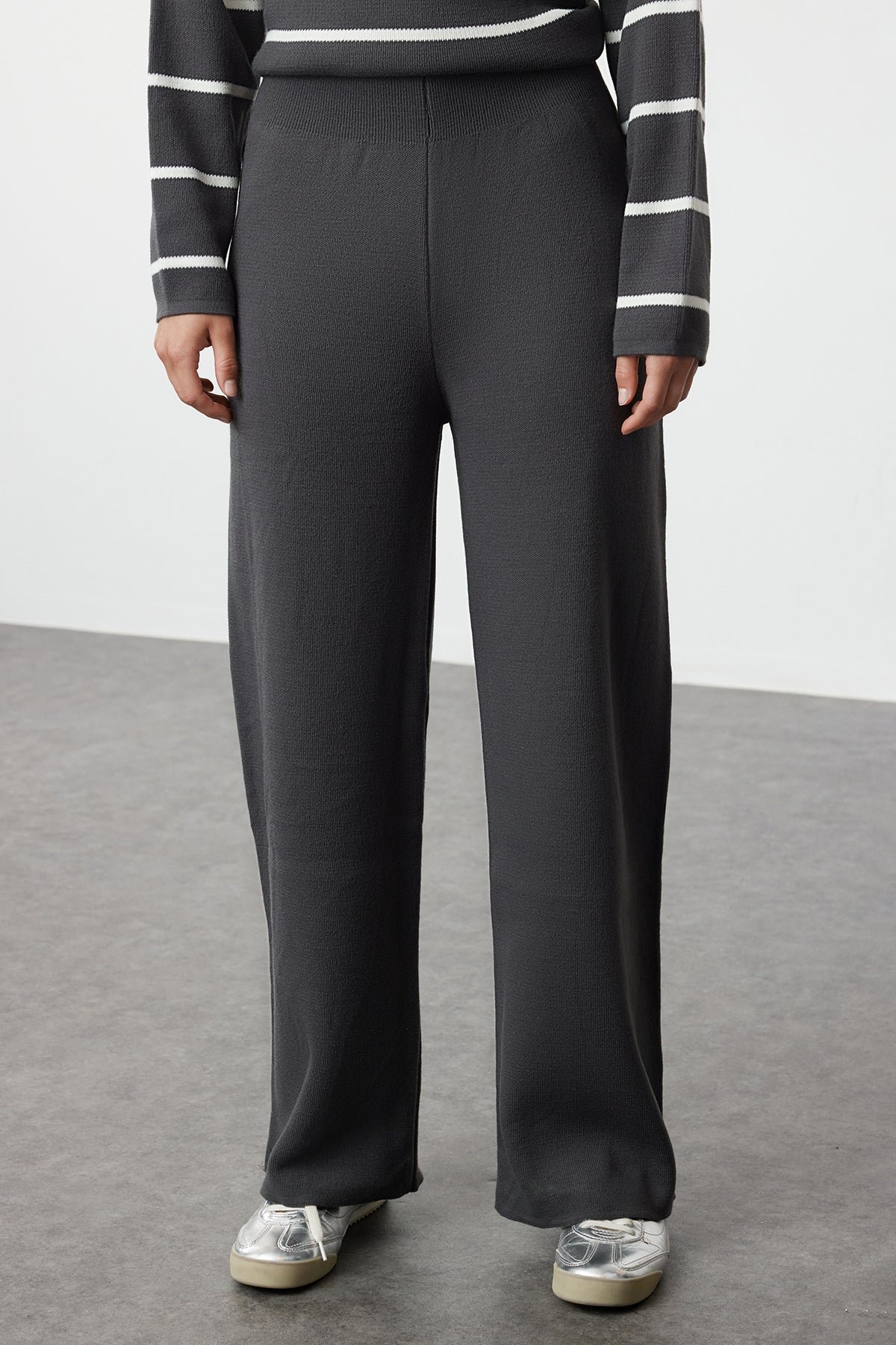 Charcoal Striped Knit Lounge Set | Relaxed Fit Pullover & Wide-Leg Pants | AtikaStyle